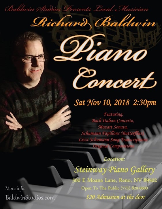 Please contact Richard for piano music and/or singing for private parties, receptions, Weddings, Religious Services and more. Richard can play cocktail music (a mixture of Jazzy tunes and light classical works, and his own light compositions). Richard will travel within 25 miles of Reno including Tahoe, Incline Village, Carson City and surrounding areas.